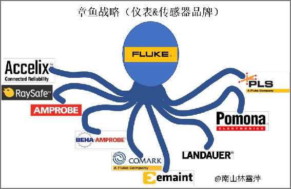 很多傳感器廠家,選擇與更大體量的儀表或者電子公司結合。而一些工業(yè)巨頭的集團發(fā)展策略,則是對傳感器采用了清晰的品牌矩陣布局,它通過多品牌、多產(chǎn)品在不同領域交叉組合。以美國電子測試工具公司福祿克Fluke為例。它是從丹納赫集團分離出來的一家公司,而丹納赫是一個并購狂人,在自動化、測量等領域有四十多個品牌。它有兩張王牌,一是丹納赫的精益生產(chǎn)極有章法,可以說是日本豐田汽車最好的學生;另外一個則是它在2019年,為GE貢獻了百年歷史上第一個非GE內(nèi)部提拔的CEO人選(延伸閱讀:通用電氣 | 愛迪生遺產(chǎn)的百年沉浮史···)。有并購也有放手,福祿克就是它“放養(yǎng)”的小巨人,2020年公司收入14億美元,旗下有十個品牌。它將傳感器跟測試工具緊密結合,孵化出了如今工業(yè)現(xiàn)場幾乎離不開的各種手持測量儀表。
